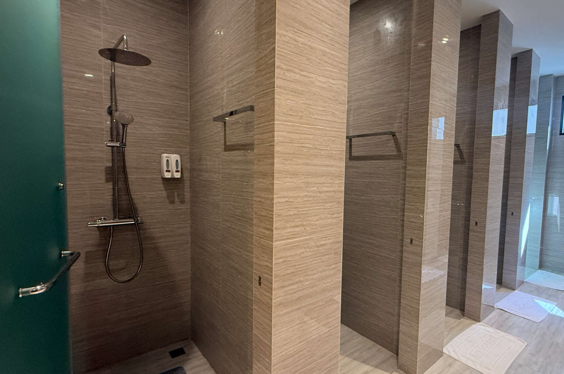 新しいクラブハウス、ロッカーはかなり小さめ、シャワーのお湯の出は問題ないが荷物を置く場所はなし。